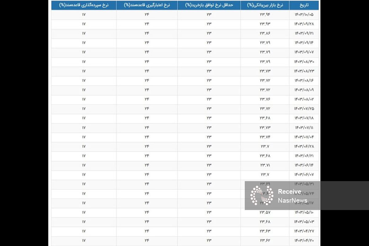 به نقل از نصر، بر اساس دادههای بانک مرکزی نرخ بهره بین بانکی در پایان هفته اوم دی ماه سال جاری (چهارشنبه پنجم دی ماه)، نسبت به هفته قبل از آن با جهش ۰.۱ درصدی به ۲۳.۹۴ درصد رسید و این میزان بالاترین میزان نرخ بهره بین بانکی از ابتدای سال جاری تا هفته نخست دی ماه است.