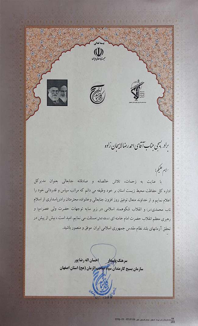 با اهدای لوح و تندیس از سوی سازمان بسیج کارمندان سپاه صاحب الزمان (عج) استان اصفهان، از دکتر احمدرضا لاهیجان ...