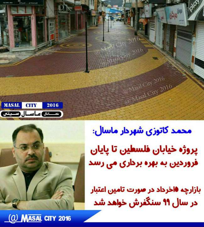 به گزارش روابط عمومی شهرداری : محمد کاتوزی شهردار ماسال با بیان اینکه پروژه سنگ فرش خیابان فلسطین در حال اتمام می باشد تاکید کرد: این پروژه تا پایان فروردین به بهره برداری می رسد. کاتوزی در ادامه افزود:بازارچه ۱۵ خرداد نیز در صورت تامین اعتبار در سال ۹۹ سنگفرش خواهد شد.